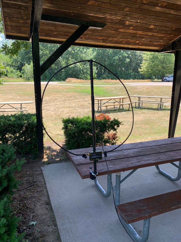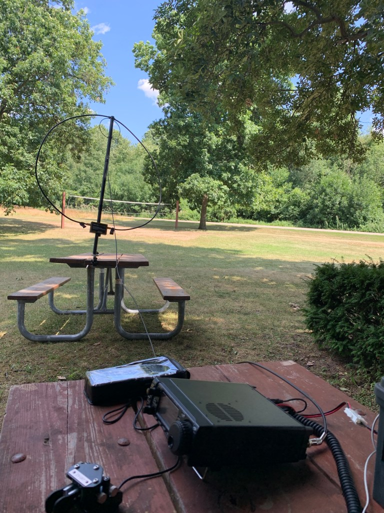 Now under a large shelter that probably had an entire semi truck worth of steel in it was probably not the best place to set up. I turned it one way, then the other. I called a few and they didn’t hear me so I turned it another way. Putting it out in the clear seemed like a good idea so I drug a table out from under the shelter. I understand the radiation pattern and tried to work it. It was a bit of a challenge but that’s half the fun.